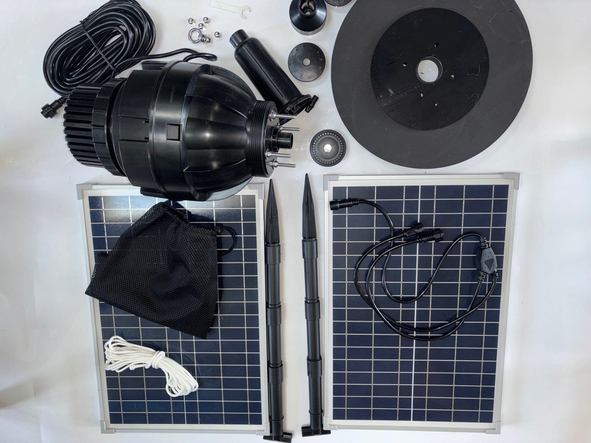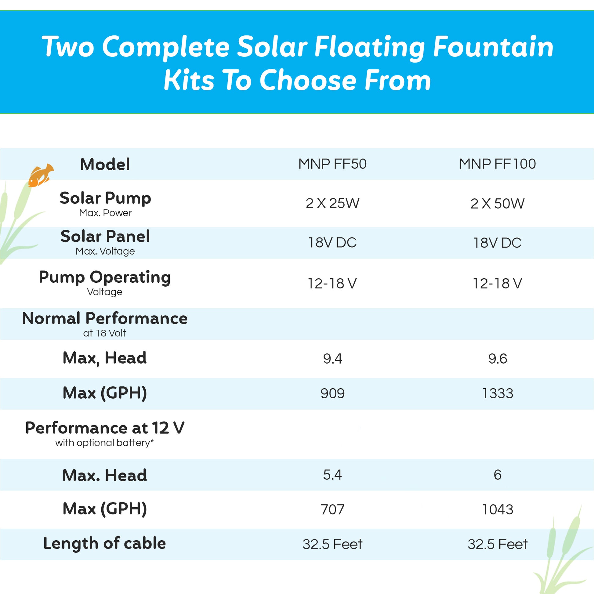 - This is a complete kit with the pump, two 25W panels for the model MNP-FF50 and two 50W for the more powerful MNP FF-100, panel stands, 32 feet of cable that can be extended using our cable extenders (sold here), and all the wiring. It even comes with a bag, string, and a hook to anchor the pump exactly where you want it. Like all solar products, it needs sunshine or very hazy cloud cover to run.