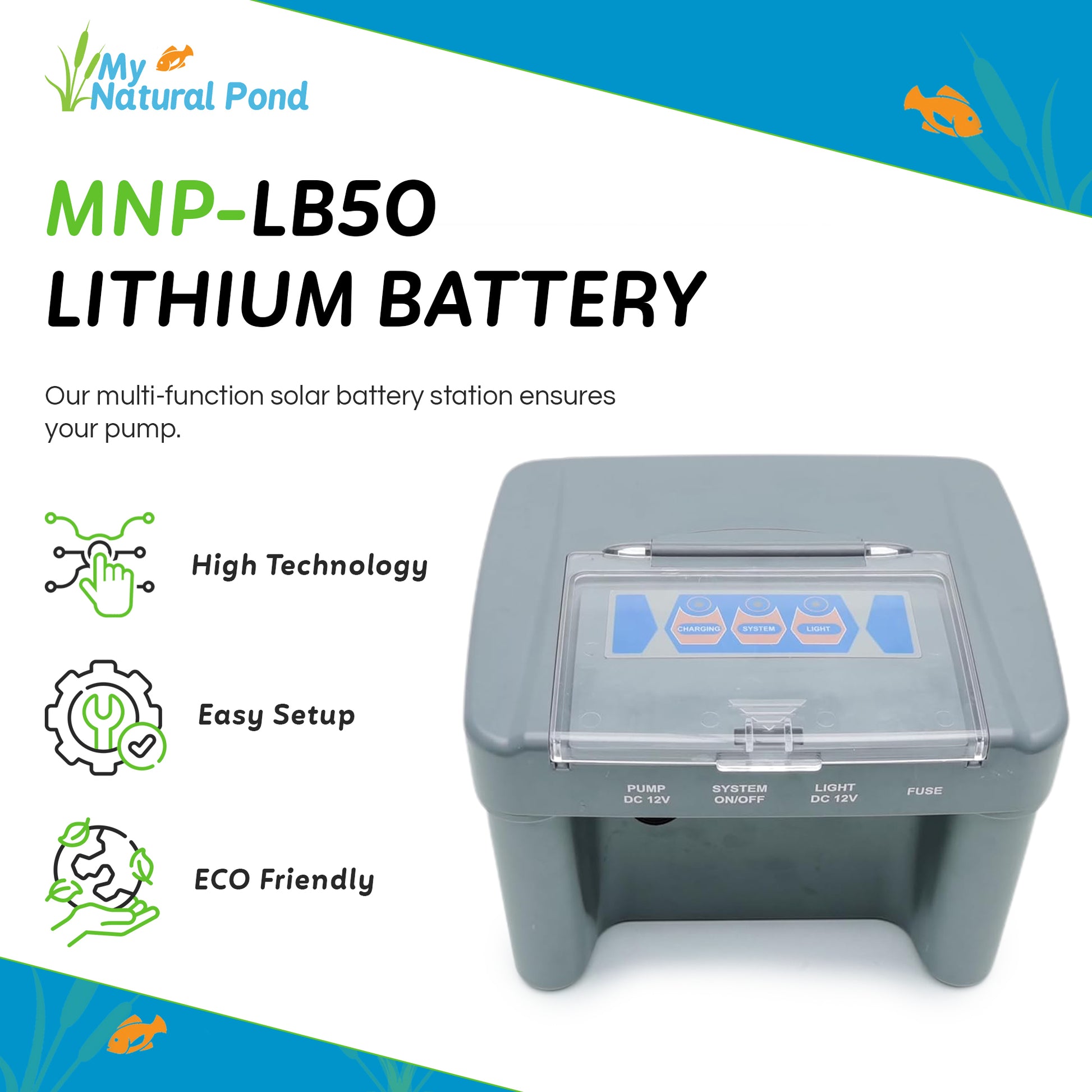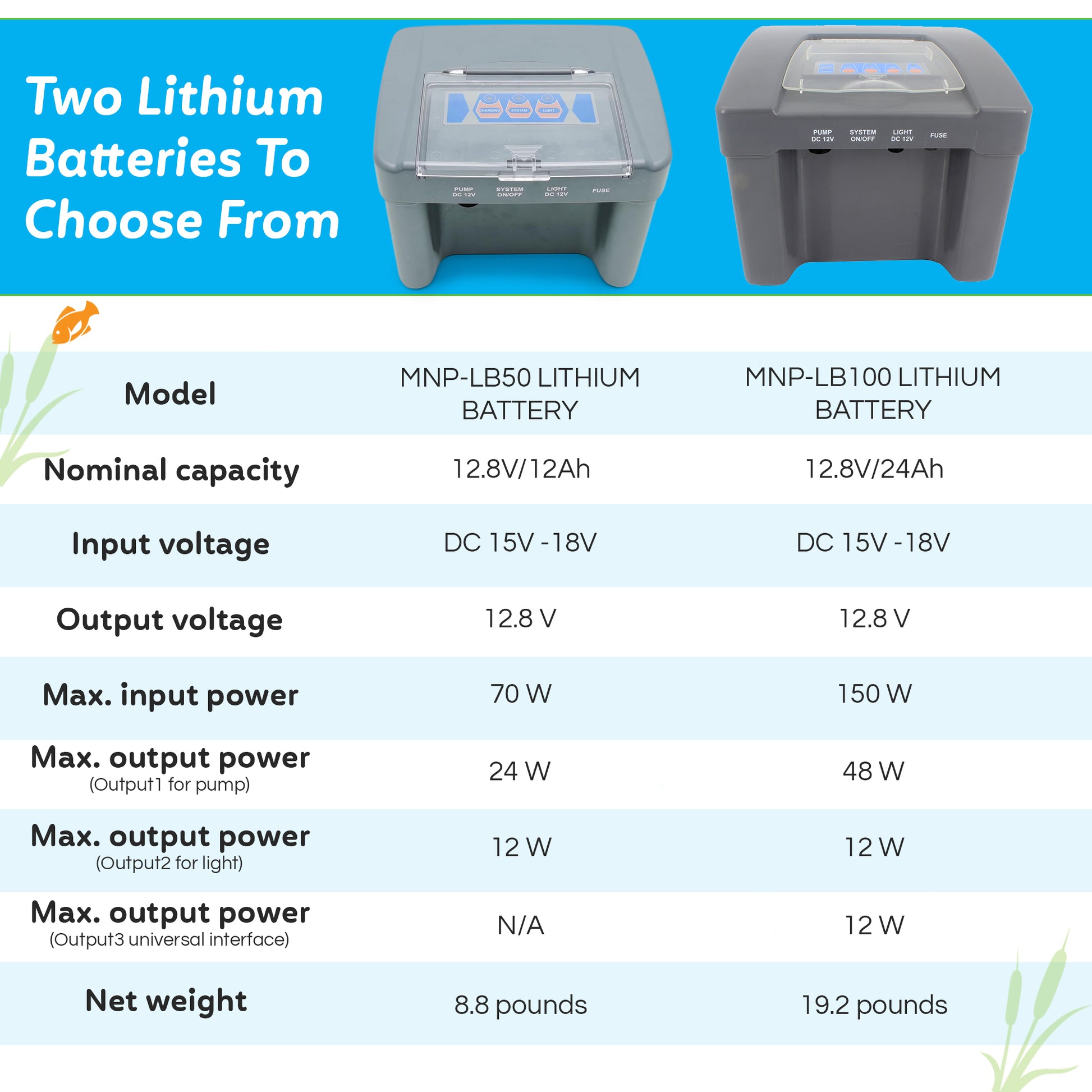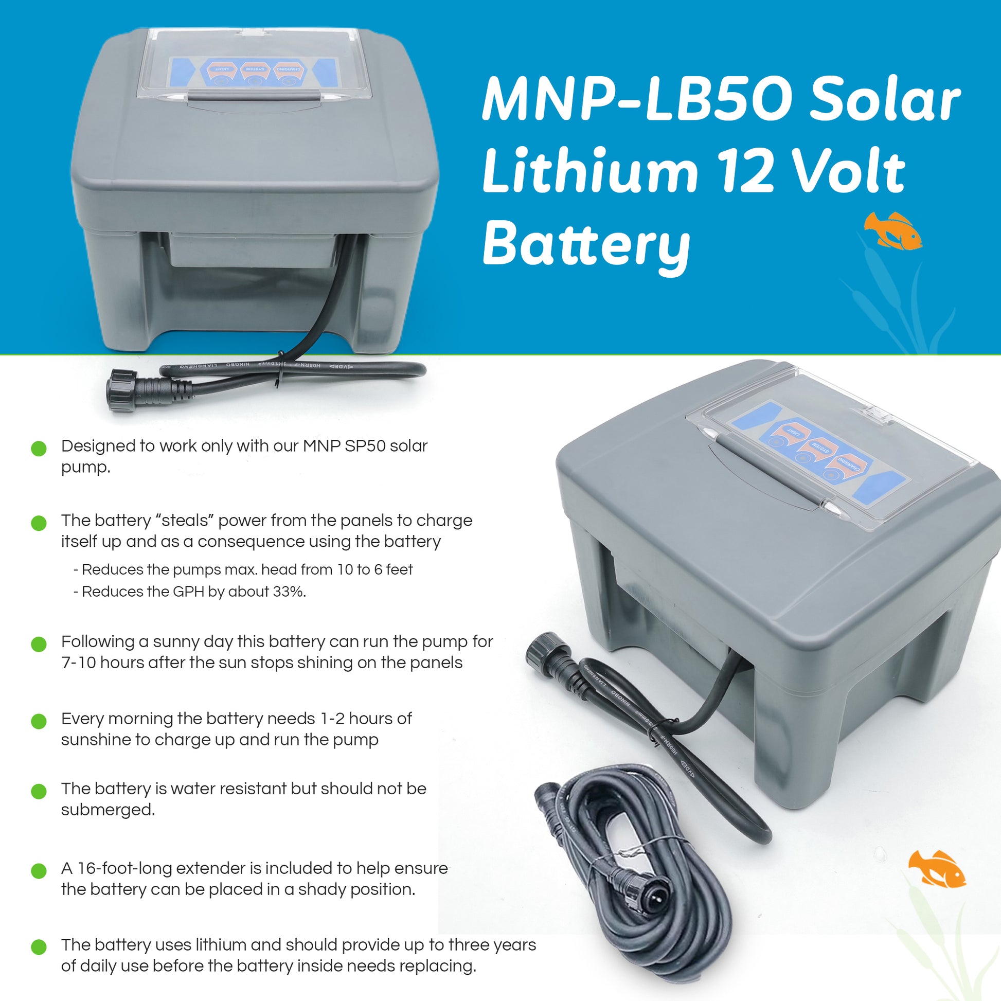 - The smaller lithium battery is designed to work only with the MNP SP50 or Floating Fountain Pump FF50 and the larger lithium battery can run all our twin panel 100W waterfall and fountain pumps. No battery can work with the SP25.