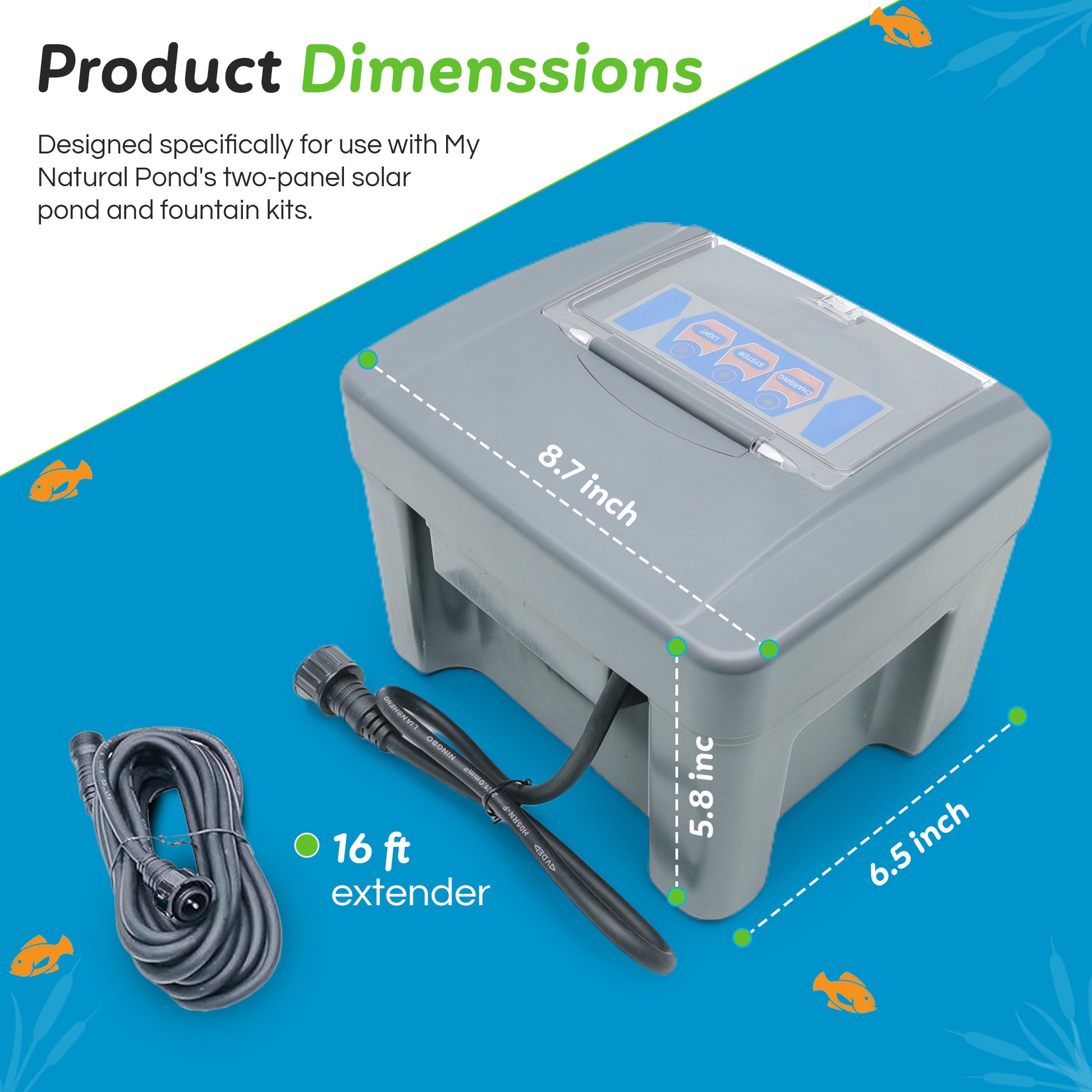 - My Natural Pond recognizes the need to have solar pumps continue running when there is limited or no sun. Providing this facility for our powerful range of solar pumps demands some trade-offs to keep the costs reasonable and the performance acceptable. These batteries meets this need by lowering the pump speed by 20% and max. head from 10 to 6 feet. In return for this performance degradation the battery can provide many hours of continuous running after the sun goes down but only on sunny days.