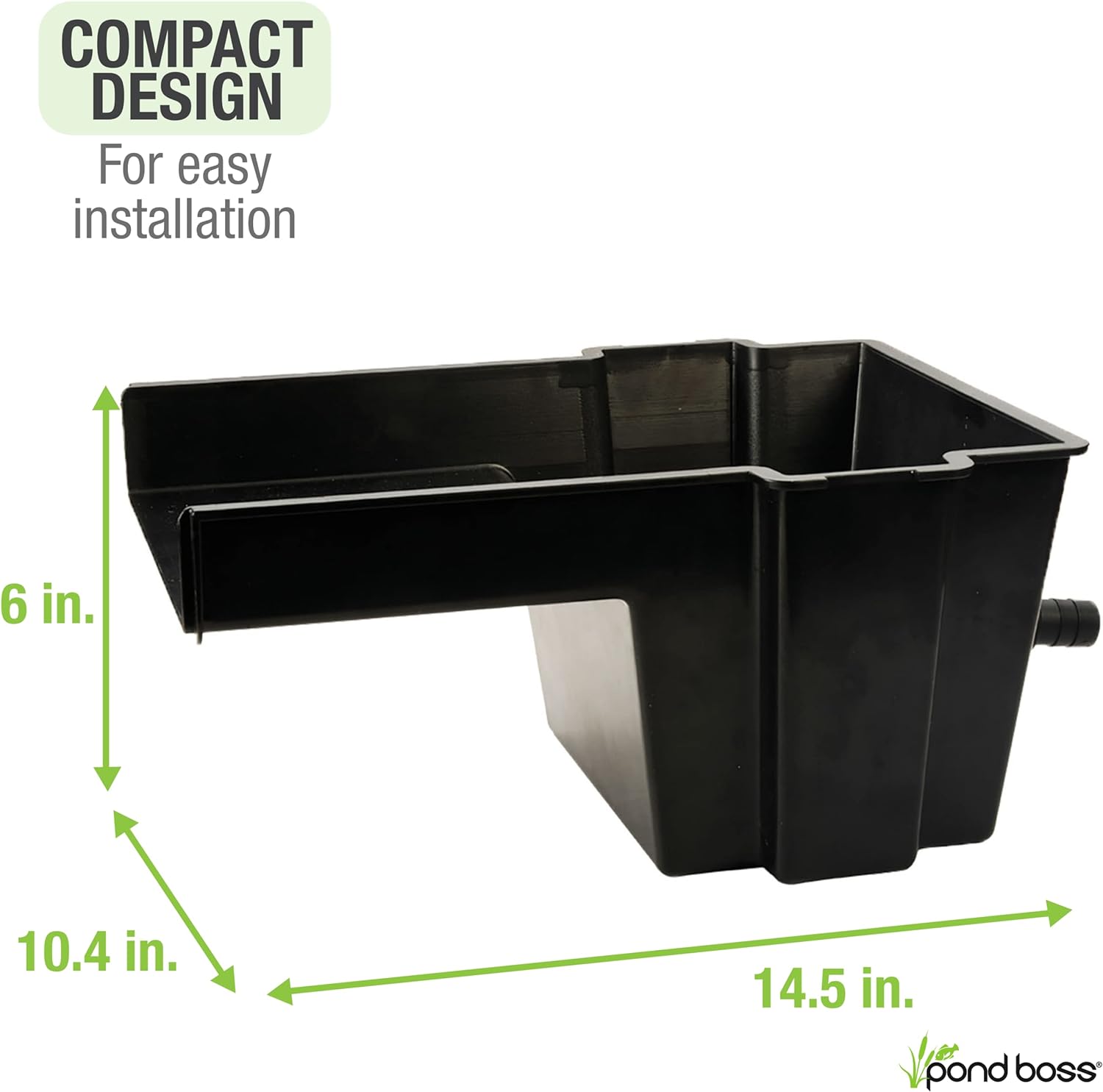 • One piece spillway. No need to glue anything together. The spillway measures 6 by 10.4 by 14.5 inches and includes a 1 inch hose adapter that fits the supplied hose perfectly. A hose clamp is included. There is space to add biological filter media and sponge layers if desired.